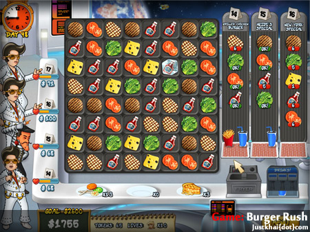 Ni satu lagi game kegilaan Khai. Burger Rush! Game yang lebih kepada Puzzle. Kalau Khai sebut puzzle je, terus keluar bosan dalam otak korang kan? So apa yang best pada game ni, game puzzle telah diubahsuai kepada yang jauh lebih menarik. Dalam game ni korang jadi penjual burger. Burger Rush ni jauh berbeza dengan Dinner Dash 2. Korang tak payah susah payah nak jadi waiter lagi. Yang pentingnya, korang just perlu susun tiga menu dalam puzzle tu je. Dah cukup semua menu korang kumpulkan, siap la burger yang customer korang nak tu. Macam biasa, jaga hati customer. Lambat sikit korang boleh la suapkan dengan kek atau Lolipop. Tapi kalau dah habis kek ngan lolipop korang tu, lu pikir la sendiri. Hehehe.