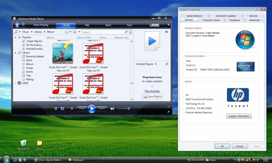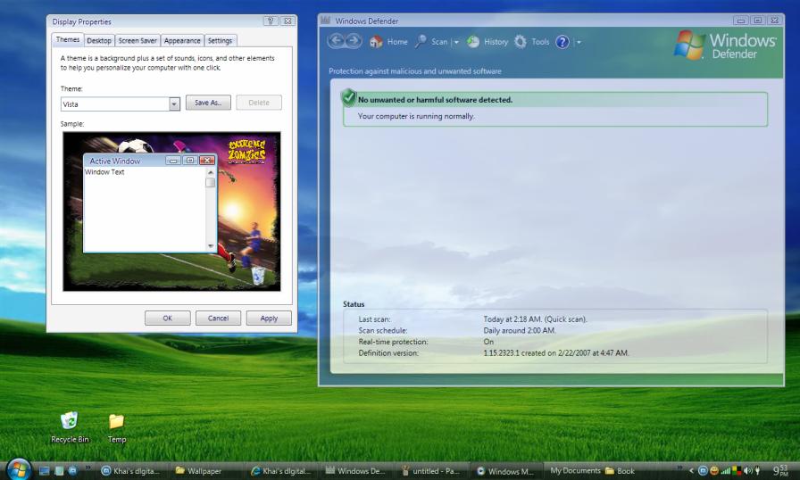 Spec system tak perlu risau.. Kalau y’all selesa sekarang menggunakan Windows XP, so tiada masalah untuk menggunakan Vista Transformation Pack ini. Kat bawah ini ada sedikit interface Windows XP yang khai pakai sekarang.. Nampak macam Windows Vista right? tapi XP aje sebenarnye.. Hahahaha.. Oh ye lupa nak ingatkan, lepas aje selesai dengan VTP ni, y’all kene right click dan click propertise kat desktop. Kemudian tekan Appearance dan pilih Aero Style (Vista – Beta 2)..